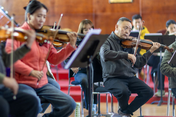 西藏自治區(qū)歌舞團(tuán)小提琴演奏家羅雪萊(右)在進(jìn)行排練(2025年11月3日攝)。新華社記者 姜帆 攝