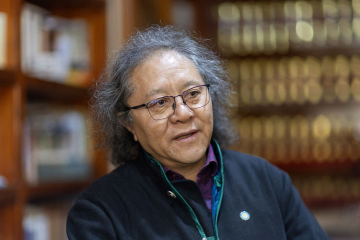 藏族音樂(lè)家覺(jué)嘎在家中與客人談?wù)撘魳?lè)理念(2025年11月4日攝)。新華社記者 姜帆 攝