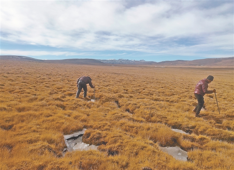 圖為聶榮縣查當(dāng)鄉(xiāng)瑪布村生態(tài)管護(hù)員正在敲碎草原上的冰層。 遲巴加 提供