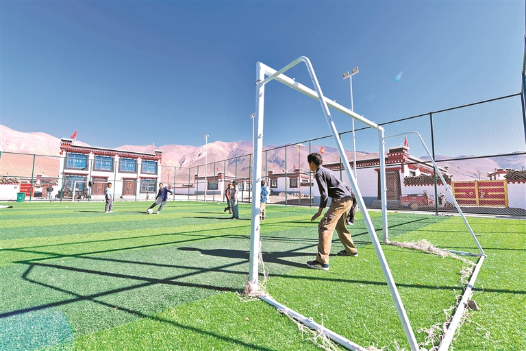 圖為定日縣長(zhǎng)所鄉(xiāng)森嘎村新修建的足球場(chǎng)上,孩子們?cè)谔咦闱?。記?旦增嘎瓦 楊子彥 扎西頓珠 攝