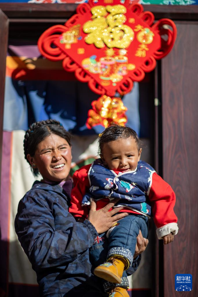 1月5日,在西藏定日縣長(zhǎng)所鄉(xiāng)雜村,母親朋瓊抱著次仁拉巴站在自家新房前。新華社記者 姜帆 攝
