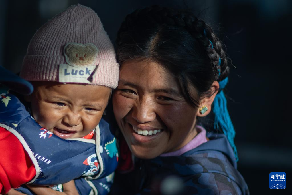 1月5日,在西藏定日縣長(zhǎng)所鄉(xiāng)雜村,母親朋瓊在家中逗弄次仁拉巴。新華社記者 姜帆 攝