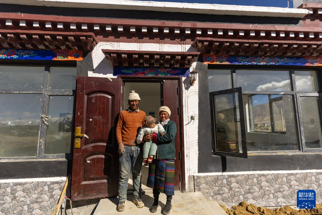 2025年10月24日,在西藏定日縣長(zhǎng)所鄉(xiāng)雜村,外公米瑪(左)、母親朋瓊和次仁拉巴在已交付的新房前合影。新華社記者 姜帆 攝