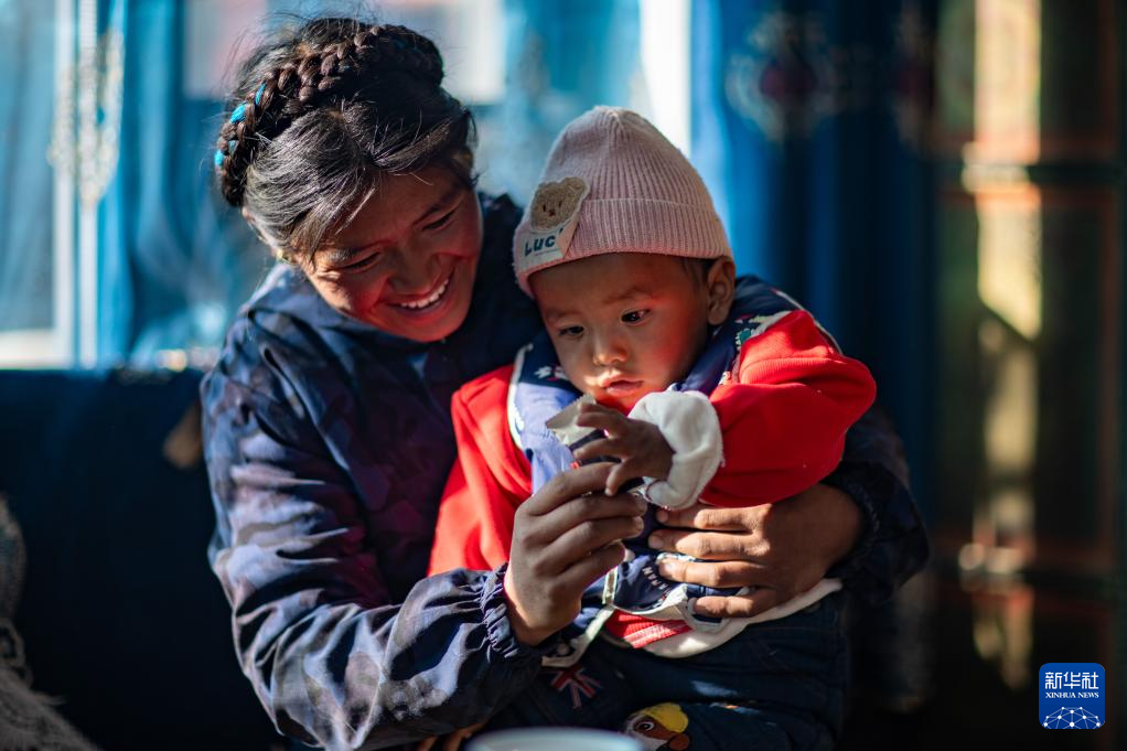 1月5日,在西藏定日縣長(zhǎng)所鄉(xiāng)雜村,母親朋瓊在家中逗弄次仁拉巴。新華社記者 姜帆 攝