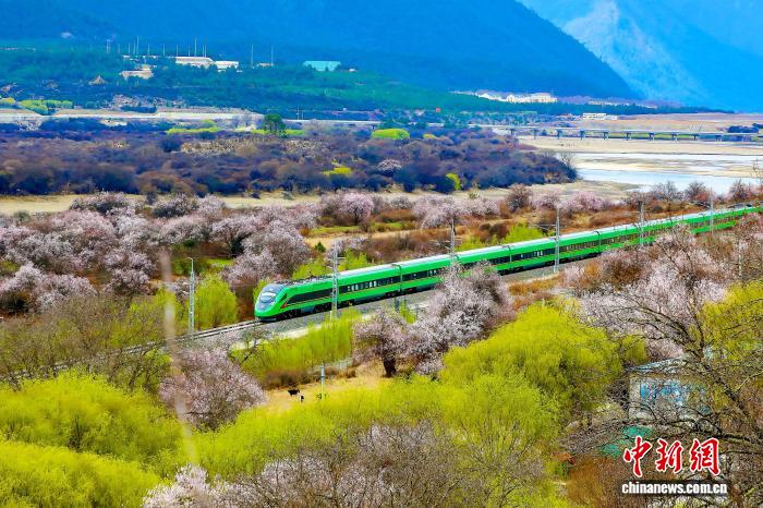 2025年西藏林芝桃花盛開時節(jié),高原復興號奔馳于拉林鐵路上。馬生明 攝