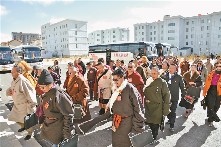 出席政協(xié)第二屆那曲市委員會第五次會議的政協(xié)委員有序步入會場。記者 汪純 攝