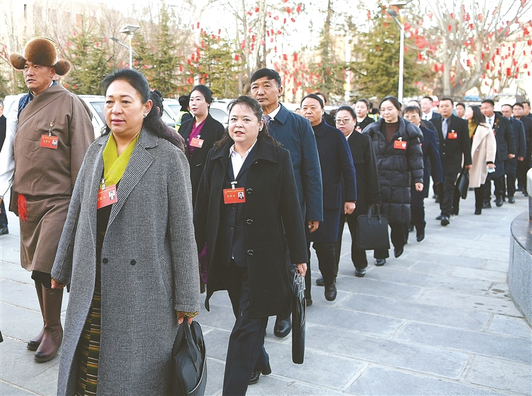 人大代表們精神飽滿、意氣風(fēng)發(fā)地步入會(huì)場(chǎng)。記者 洛桑 攝