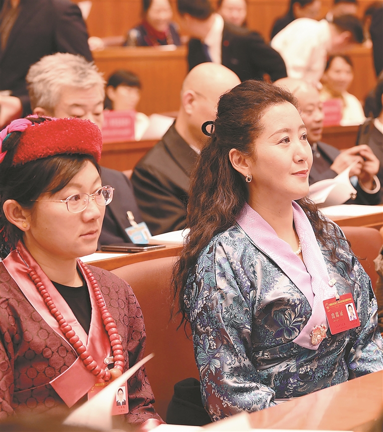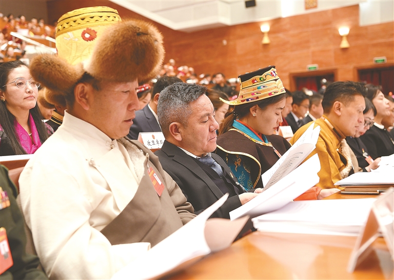 人大代表們認(rèn)真聆聽政府工作報(bào)告。記者 洛桑 攝