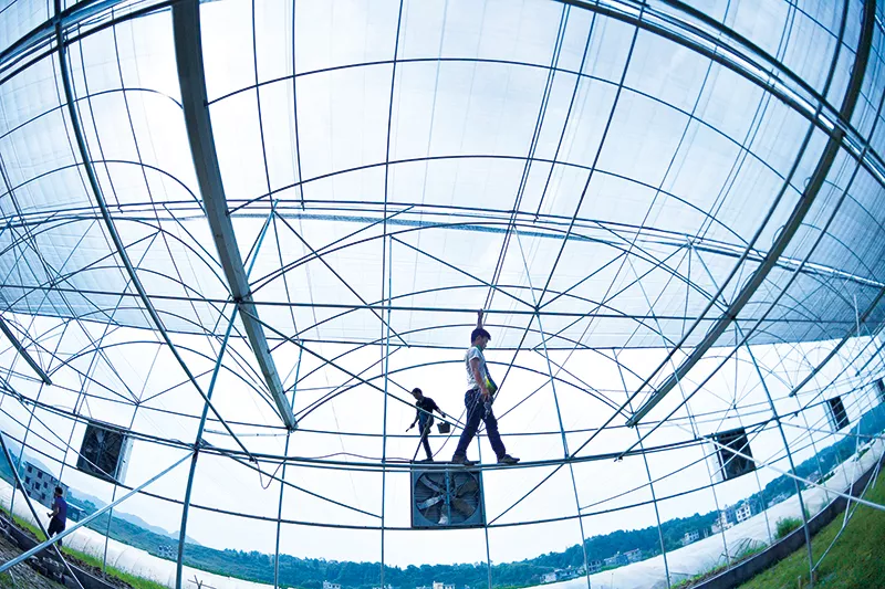 近年來,湖北省恩施土家族苗族自治州宣恩縣大力發(fā)展“設施農(nóng)業(yè)”,通過企業(yè)、合作社、家庭農(nóng)場等將農(nóng)民手中的土地進行流轉(zhuǎn),發(fā)展農(nóng)業(yè)觀光園和生態(tài)采摘園,為當?shù)剞r(nóng)民開辟一條產(chǎn)業(yè)脫貧的新路。圖為宣恩縣李家河鎮(zhèn)二虎寨村,工人們在搭建溫控大棚。 新華社記者 宋文/攝