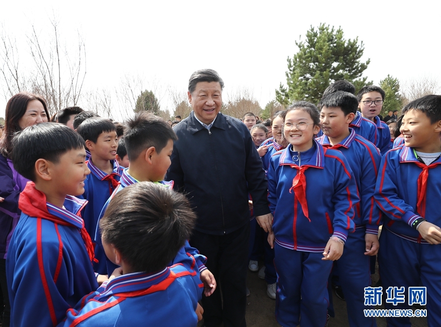 4月8日,黨和國(guó)家領(lǐng)導(dǎo)人習(xí)近平、栗戰(zhàn)書(shū)、汪洋、王滬寧、趙樂(lè)際、韓正、王岐山等來(lái)到北京市通州區(qū)永順鎮(zhèn)參加首都義務(wù)植樹(shù)活動(dòng)。這是習(xí)近平同少先隊(duì)員在一起。新華社記者鞠鵬 攝