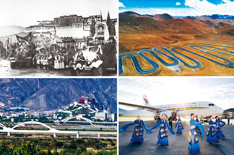 民族區(qū)域自治制度在西藏的偉大實踐,使西藏實現(xiàn)了經(jīng)濟社會發(fā)展短短幾十年、跨越上千年的歷史性巨變。左上圖:1954年12月25日,川藏、青藏兩條公路勝利通車到拉薩,在布達拉宮廣場上舉行盛大通車儀式(資料照片)。左下圖:2016年6月27日,青藏鐵路列車經(jīng)過拉薩(新華社記者 普布扎西/攝)。右上圖:2017年5月19日,通往珠峰的公路(新華社記者 普布扎西/攝)。右下圖:2011年7月26日,西藏航空有限公司正式開航(新華社記者 覺果/攝)。