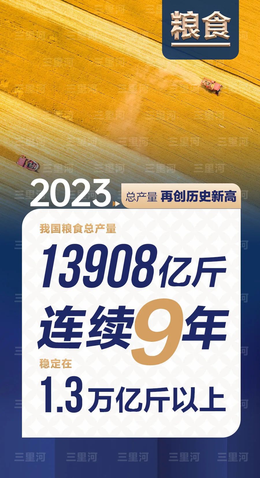 2023年,中國(guó)糧食產(chǎn)量再創(chuàng)歷史新高,連續(xù)9年穩(wěn)定在1.3萬億斤以上。