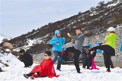 圖為4月6日,在林芝色季拉山上玩雪以及拍照留念的內(nèi)地游客。白娟 攝