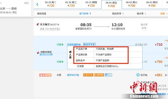 記者在攜程網(wǎng)上預訂6月1日北京到昆明的東方航空MU5714票價為710元(2.8折),顯示“只退機建、燃油費”“不支持產(chǎn)品更改”。