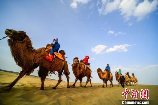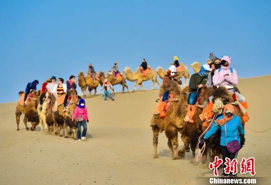 圖為大批游客騎駱駝體驗敦煌大漠風(fēng)光。 王斌銀 攝
