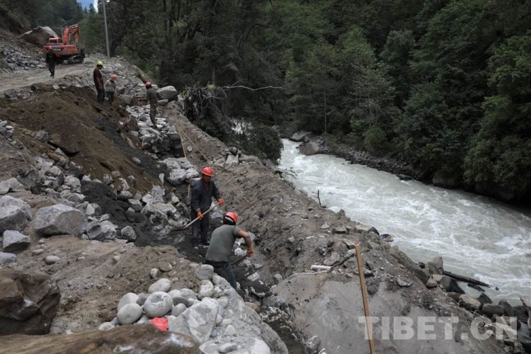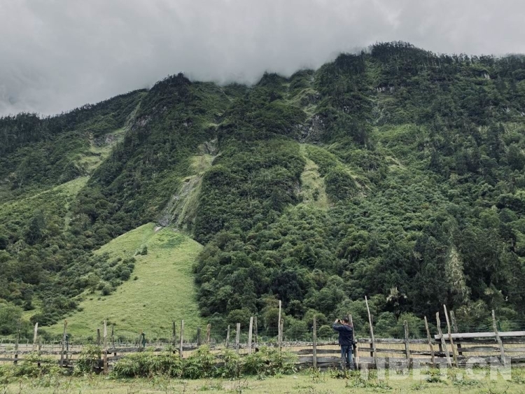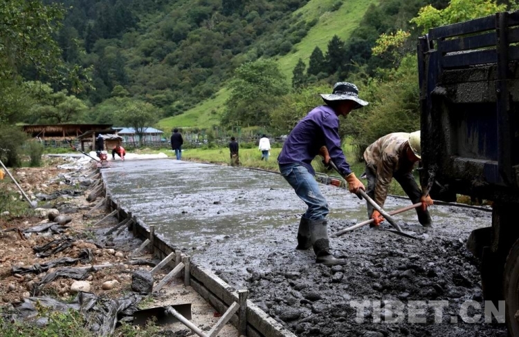 離桑巴亞中原始森林越來(lái)越近,看到工人們正在修水泥路,這條路通向村里四朗倫珠、來(lái)玉措姆這兩戶最靠近山腳的人家。