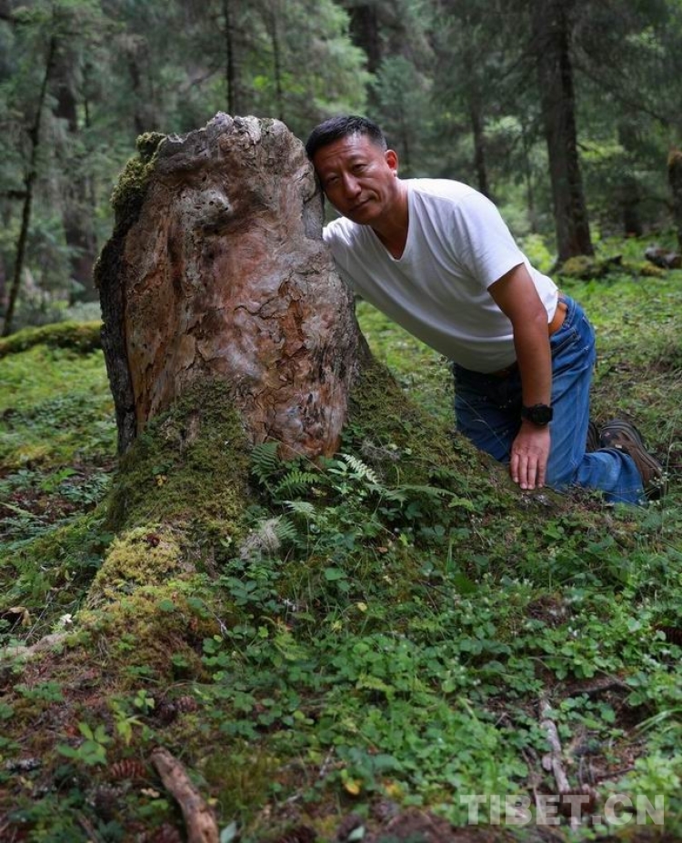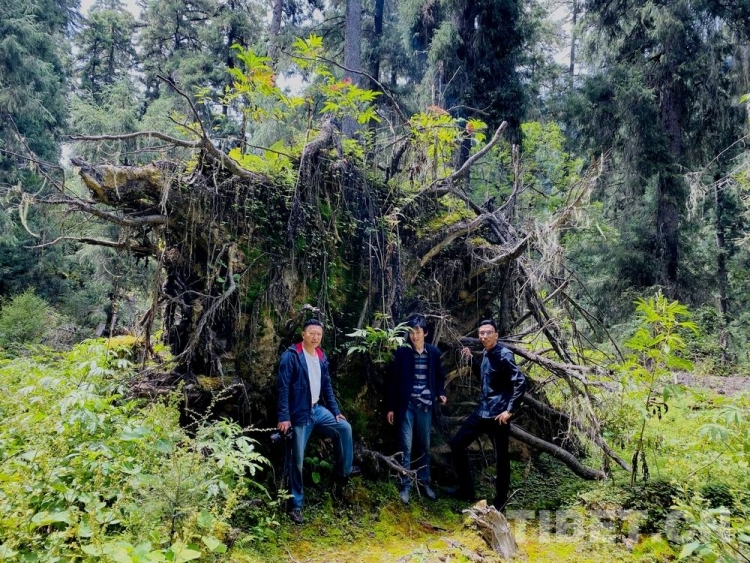 圖為作者一行在一棵于2018年被大風(fēng)吹倒的大樹(shù)留下的樹(shù)樁下合影