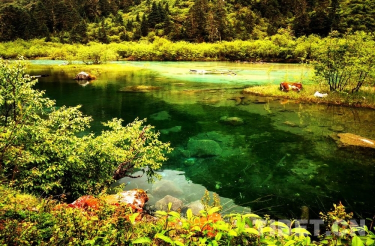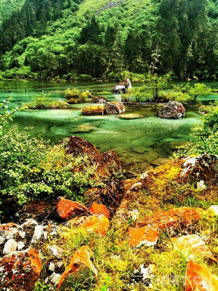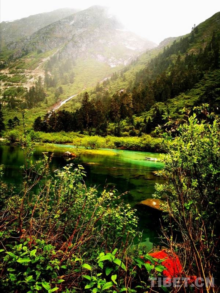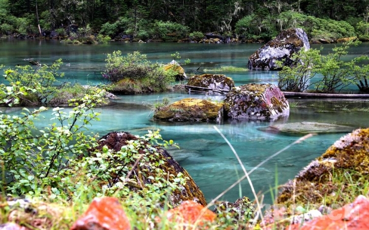 少女般的冰湖,藏于青山綠樹中,伏于深林密草內(nèi),異常迷人。站在不同的視角看冰湖,同一水域,卻有不同的顏色,綠中透著藍(lán),藍(lán)中泛著橙、橙中映著赤、赤中蘊(yùn)著黃,斑斕奪目,攝人心魄。湖水周圍的花草樹木長得異常茂盛,五光十色的倒影使湖水更加瑰麗。