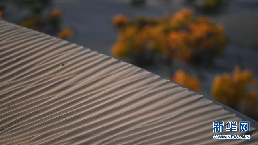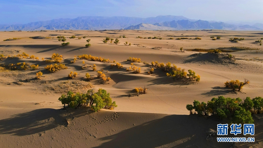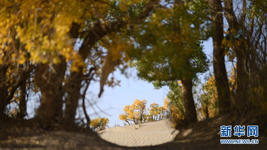 披上了金黃色外衣的胡楊林,成為沙漠里的一抹亮色。新華網(wǎng) 潘彬彬攝