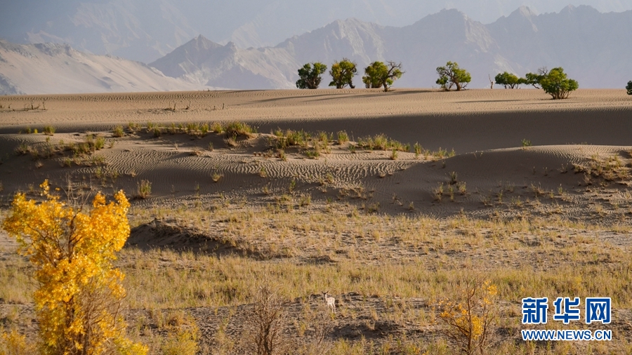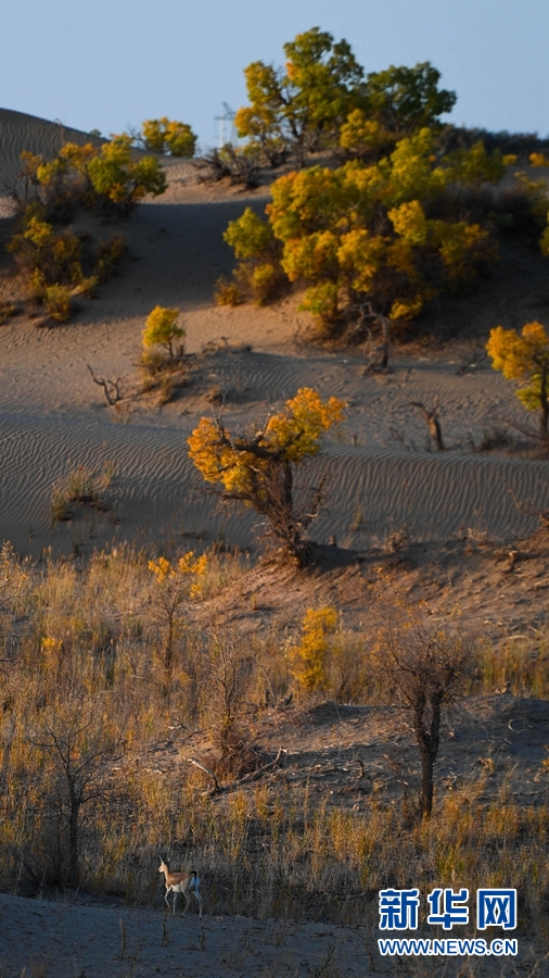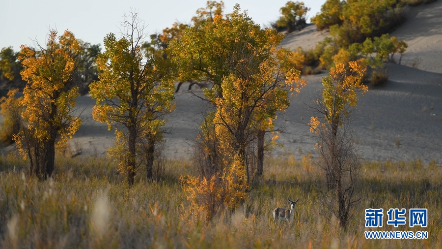 一只鵝喉羚在胡楊林內(nèi)活動(dòng)。新華網(wǎng) 潘彬彬 攝