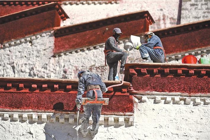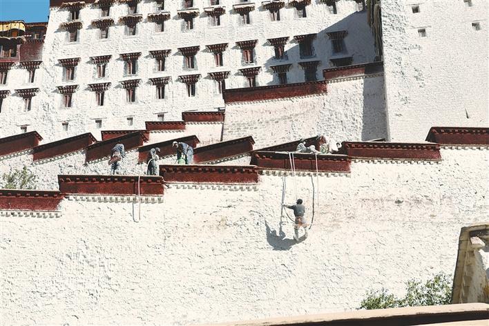世界文化遺產(chǎn)布達(dá)拉宮10月26日起迎來了一年一度的粉刷季,工作人員將用10余天的時(shí)間對宮墻、白塔、窗框進(jìn)行整體粉刷,為布達(dá)拉宮美顏。圖為10月28日,施工人員給布達(dá)拉宮墻體噴灑涂料。記者 李洲 洛桑 攝