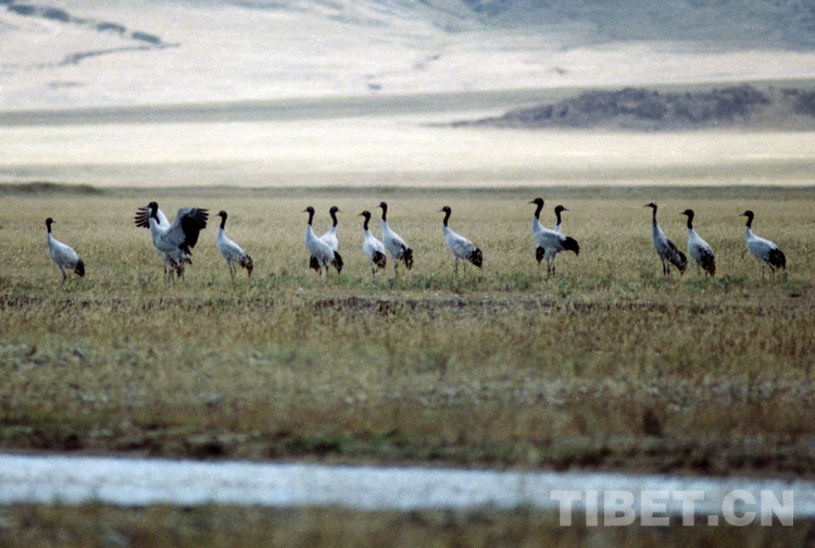 這是在藏北高原申扎縣濕地棲息的國家一級(jí)保護(hù)動(dòng)物黑頸鶴(唐召明2001年攝)
