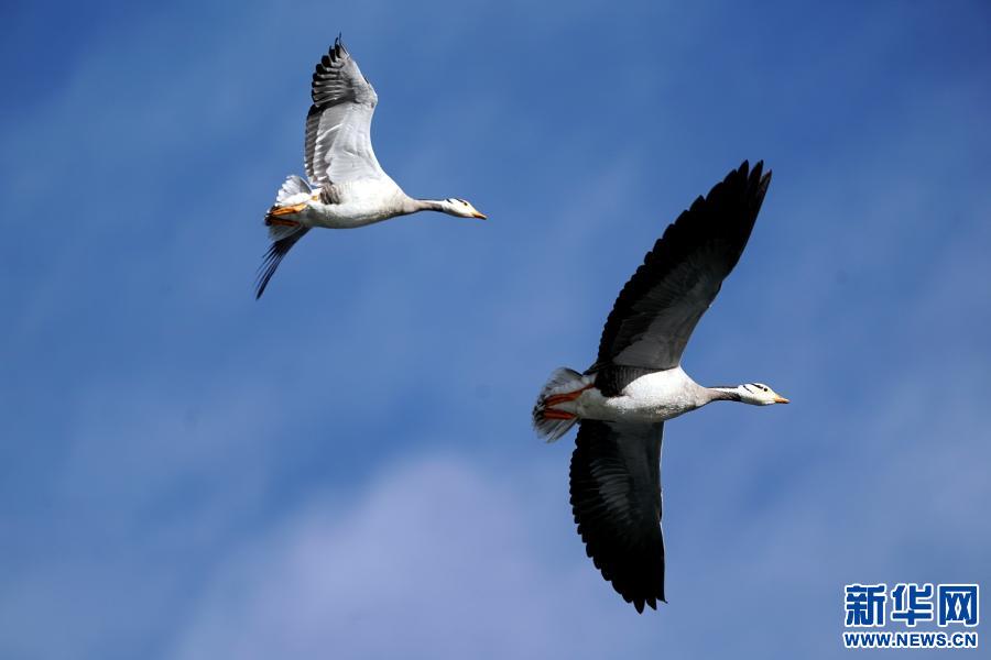 天光云影,百鳥(niǎo)翔集,一群赤麻鴨在都蘭湖國(guó)家濕地公園上空飛翔。(11月21日攝)新華網(wǎng) 潘彬彬攝