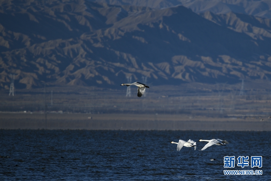 三只大天鵝在都蘭湖國(guó)家濕地公園上空飛翔。(11月21日攝)新華網(wǎng) 潘彬彬攝