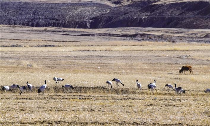 遠遠望去,只見高頸長腿的黑頸鶴一邊覓食、一邊梳理羽毛,悠然自得。如果耐心一點在田間蹲守,不時還可以看到成群的黑頸鶴飛翔于冬日的藍天下,姿態(tài)優(yōu)美地盤旋,尋找合適的田間落下。旦增說,它們要覓食至傍晚時分,才成群結隊飛回虎頭山水庫。