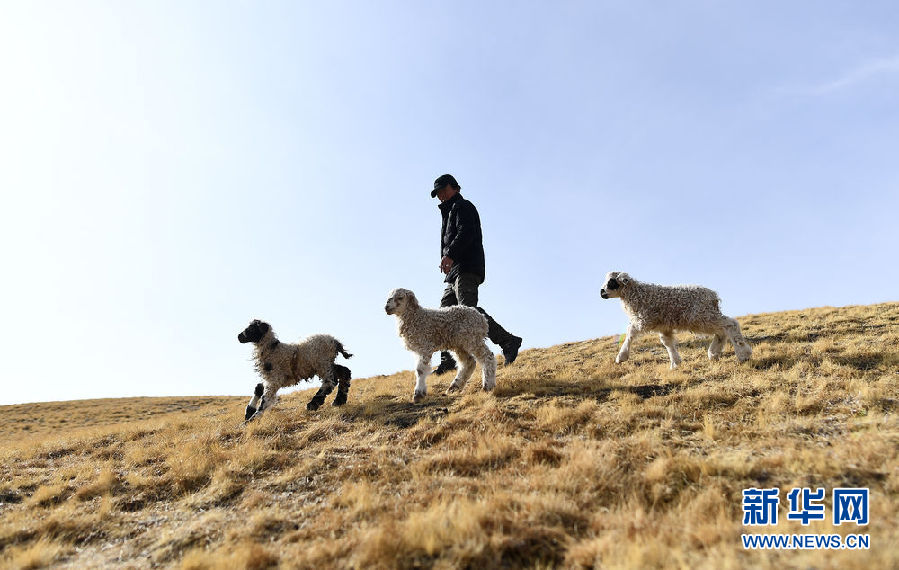 在青海省剛察縣泉吉鄉(xiāng)寧夏村,彭毛太家剛出生不久的三只小羊羔在草場上撒歡(11月20日攝)。 新華社記者 張宏祥 攝