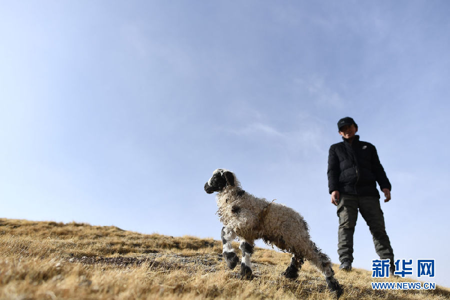 在青海省剛察縣泉吉鄉(xiāng)寧夏村,達(dá)日杰懷抱一只小羊羔(11月12日攝)。 新華社記者 張宏祥 攝