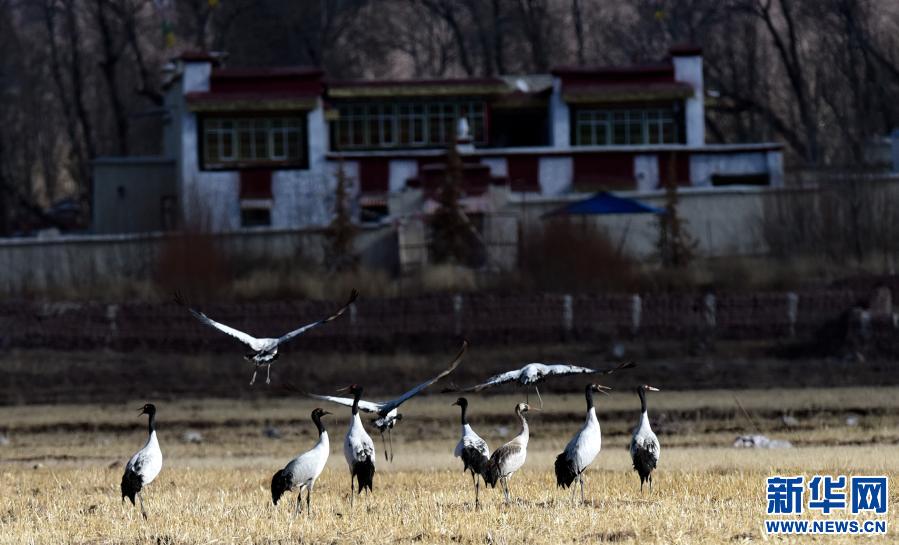 林周縣黑頸鶴自然保護(hù)區(qū)里的黑頸鶴(12月12日攝)。新華社記者 張汝鋒 攝