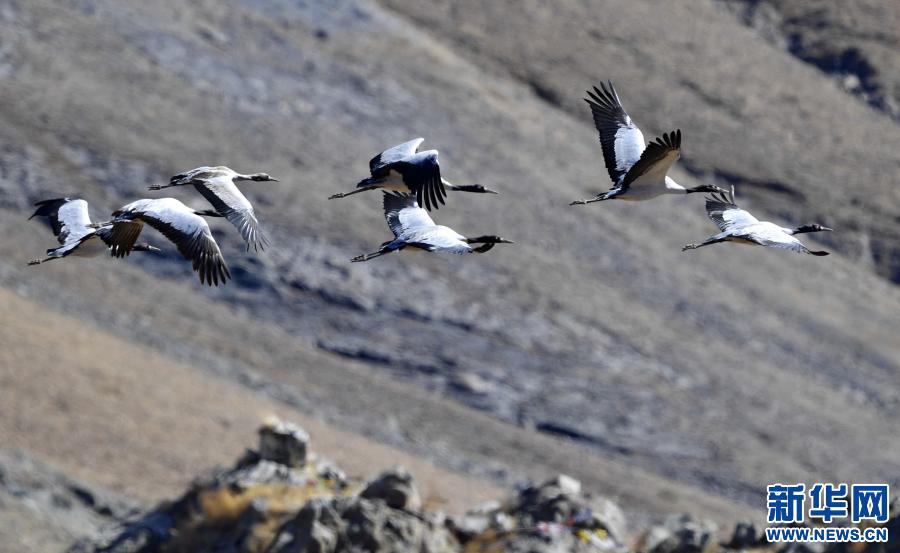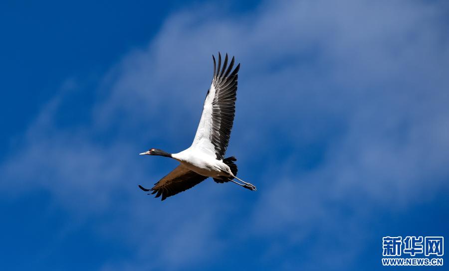黑頸鶴在林周縣黑頸鶴自然保護(hù)區(qū)上空飛翔(12月12日攝)。新華社記者 黃豁 攝
