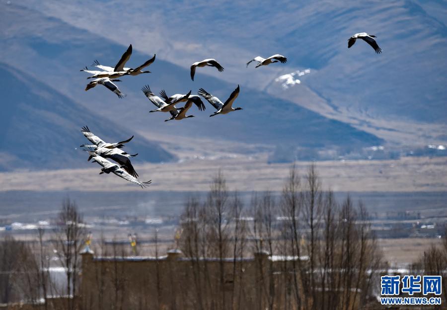 飛翔在林周縣黑頸鶴自然保護(hù)區(qū)上空的黑頸鶴集群(12月12日攝)。新華社記者 黃豁 攝