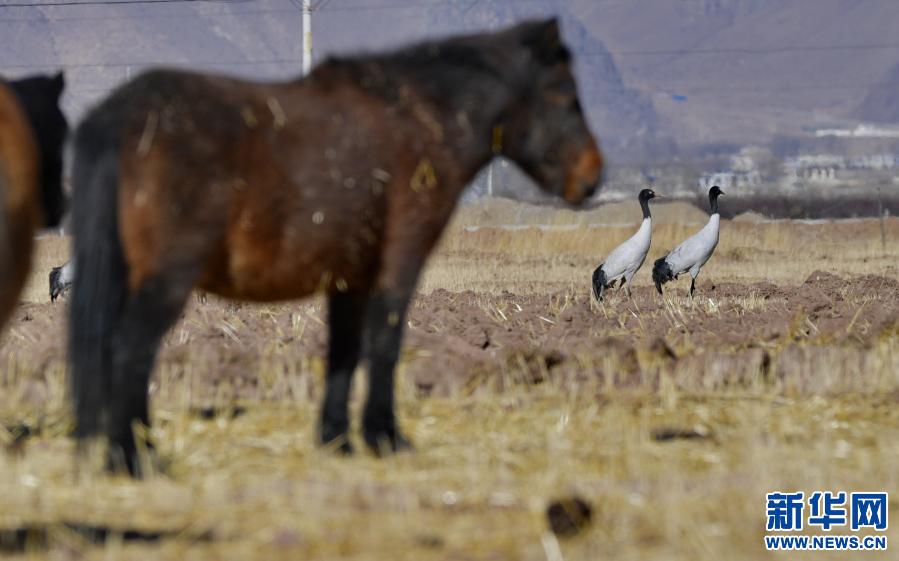 棲息在林周縣卡孜鄉(xiāng)農(nóng)田里的黑頸鶴(12月12日攝)。新華社記者 張汝鋒 攝