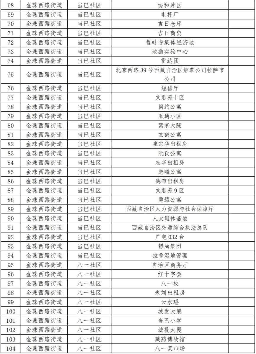 19.扎細街道團結新村社區(qū)(拉薩市第三小學、拉薩市規(guī)劃設計院、自治區(qū)國資委、自治區(qū)藏醫(yī)院、自治區(qū)疾控中心、阜康醫(yī)院住院部、納木措賓館);