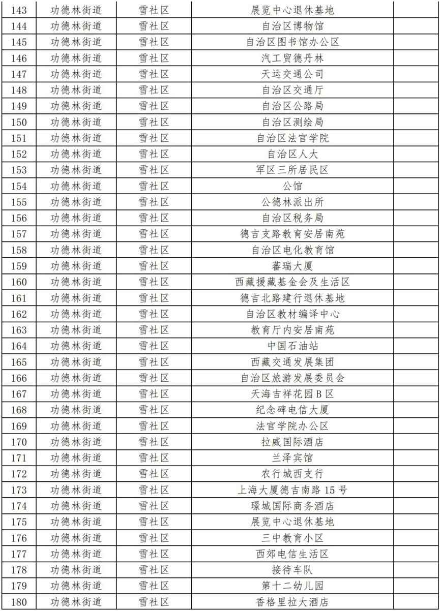 17.功德林街道加措社區(qū)(伊成檢測站、箭達崗公寓、審計廳生活區(qū)、西藏革命紀念館工地、自治區(qū)血液中心、拉薩七中、衛(wèi)健委辦公區(qū)、拉薩海關、中國石油(當熱路)、自治區(qū)衛(wèi)健委、旅游大廈、南方公司、諾迪康藥業(yè)、自治區(qū)科技廳、文居苑(二區(qū))、回族林卡、拉薩消防、西藏銀行、自治區(qū)編譯局、鴻運家具城、財政廳、西藏銀行、中國銀行、老魚莊、西藏稅務、十三幼兒園、自來水公司、中國人保財險、中國石化、哈達工地、巨龍銅業(yè)、生態(tài)環(huán)境廳、泰和國際、金珠路14號(國保支隊)、豐田4S店、110便民支隊、第三安居苑、財經學院、農銀大學、圣州加氣站、錦江之星酒店、自治區(qū)衛(wèi)校、拉薩市農行退休基地、財康青年旅社、甘丹寺招待所、西藏自治區(qū)疾控中心第二工作區(qū)、拉薩市運管局、尼泊爾領事館、加措社區(qū)居委會、金陵酒店、澤當飯店、環(huán)球大廈、區(qū)工人療養(yǎng)院、交警總隊、銀都賓館);