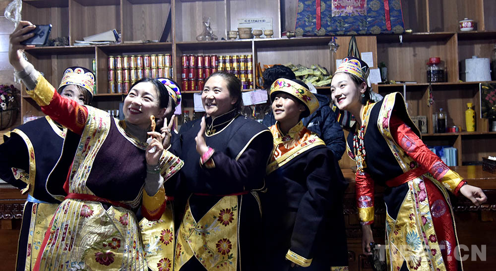 圖為工布新年“古突”夜,游客和當地群眾身著盛裝合影留念(資料圖)
