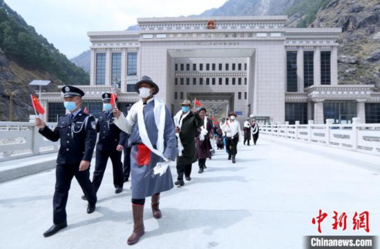 吉隆出入境邊防檢查站移民管理警察帶領退休干部參觀新建熱索大橋?!⌒じ毁F 攝