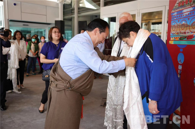 活動(dòng)中,班覺才仁會(huì)長(zhǎng)為鄧先生獻(xiàn)上哈達(dá),祝福這次展出圓滿成功!
