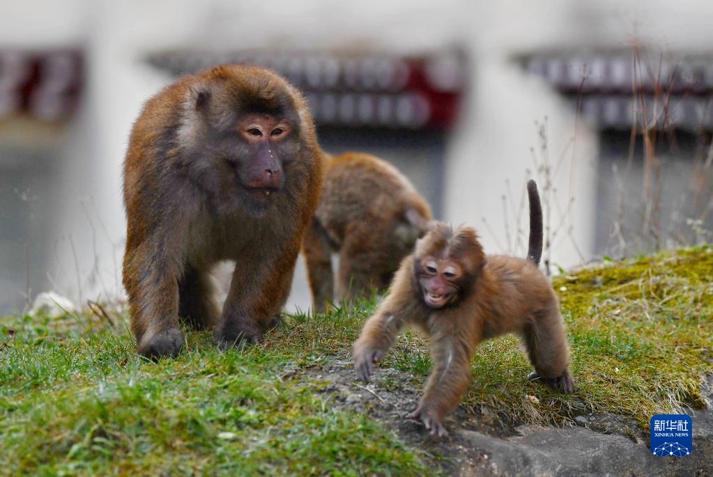 獼猴在勒布溝景區(qū)一幢建筑物前玩耍(4月25日攝)。新華社記者 邵澤東 攝