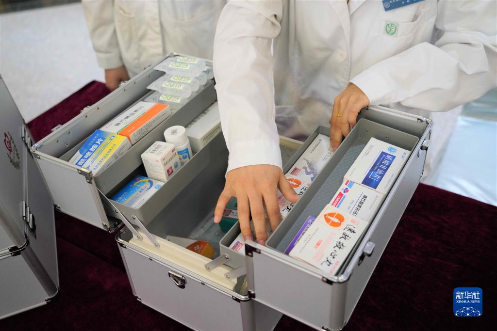 5月26日,北京高原適應(yīng)研究康復(fù)中心的醫(yī)護(hù)人員在介紹隨車(chē)醫(yī)藥箱。新華社發(fā)(王靜頤攝)
