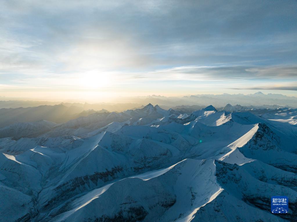 這是在海拔8000米左右高空拍攝的珠穆朗瑪峰和喜馬拉雅山脈群山(5月23日攝,無(wú)人機(jī)照片)。新華社記者 洛卓嘉措 攝