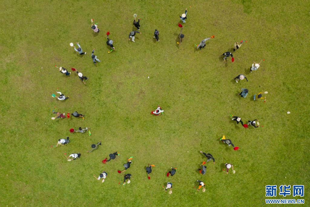 7月12日,西藏昌都市丁青縣尺犢鎮(zhèn)烏巴村文藝演出隊在排練(無人機照片)。 新華網(wǎng) 旦增努布 攝