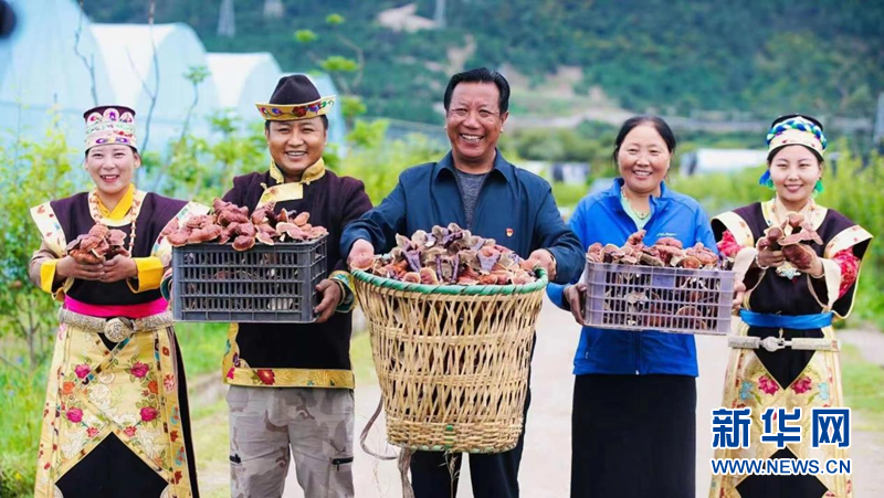 圖為紅太陽科技示范家庭農(nóng)場(chǎng)創(chuàng)始人尼瑪帶著村民慶祝靈芝豐收。(紅太陽科技示范家庭農(nóng)場(chǎng)供圖)