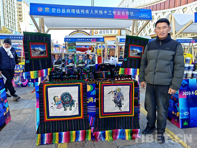圖為定日縣崗嘎鎮(zhèn)殘疾人民族手工業(yè)專業(yè)合作社工作人員索朗次仁在自己的展臺(tái)前留影