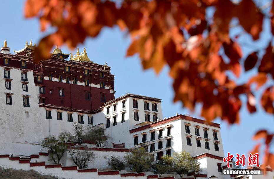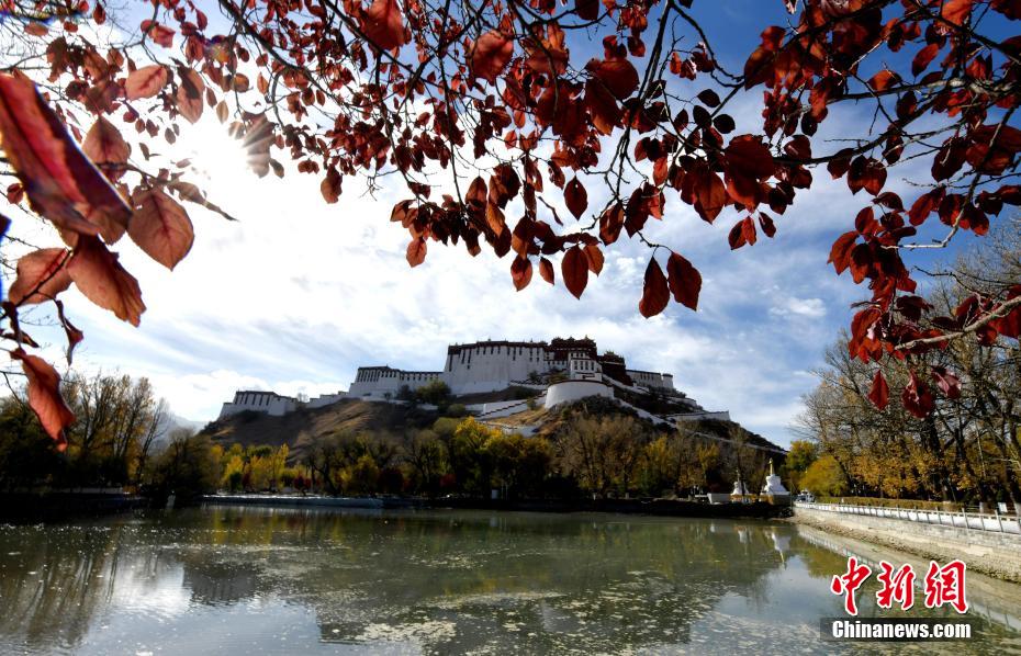 圖為初冬拉薩,布達(dá)拉宮在周圍紅黃樹葉的映襯下色彩斑斕。 李林 攝