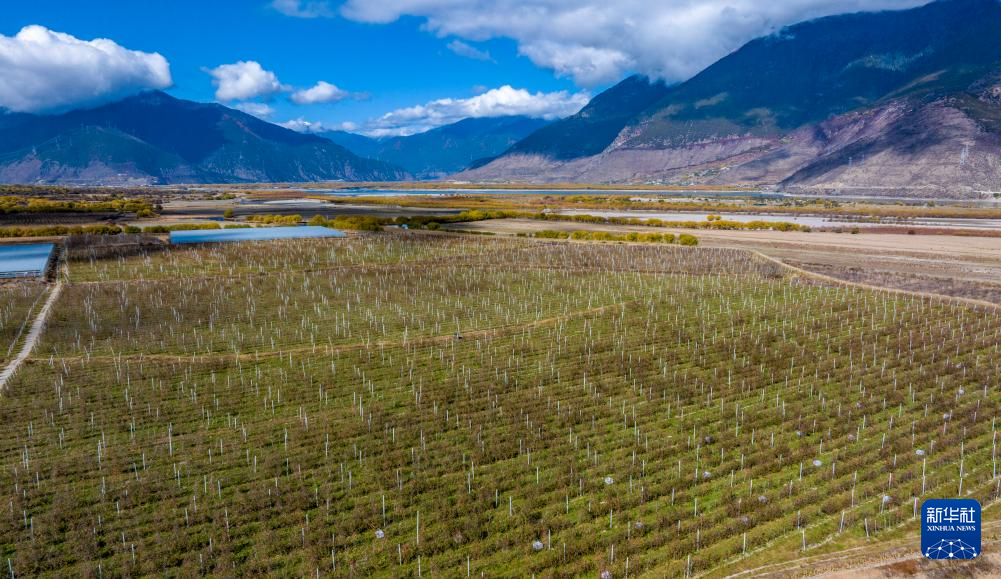 鳥瞰米林市羌納鄉(xiāng)西藏林芝現(xiàn)代蘋果標準化園區(qū)(無人機照片,11月13日攝)。新華社記者 姜帆 攝