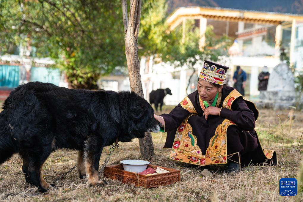 工布新年的大年初一,拉巴卓瑪按照習(xí)俗“請狗赴宴”,為家里的狗端來了新鮮牛肉、糌粑和牛奶(11月14日攝)。新華社記者 丁增尼達 攝
