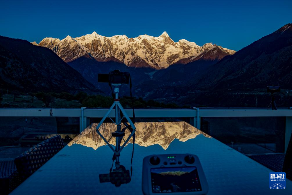 攝影愛(ài)好者在索松村一家酒店樓頂拍攝日落時(shí)分的南迦巴瓦峰(11月13日攝)。新華社記者 姜帆 攝
